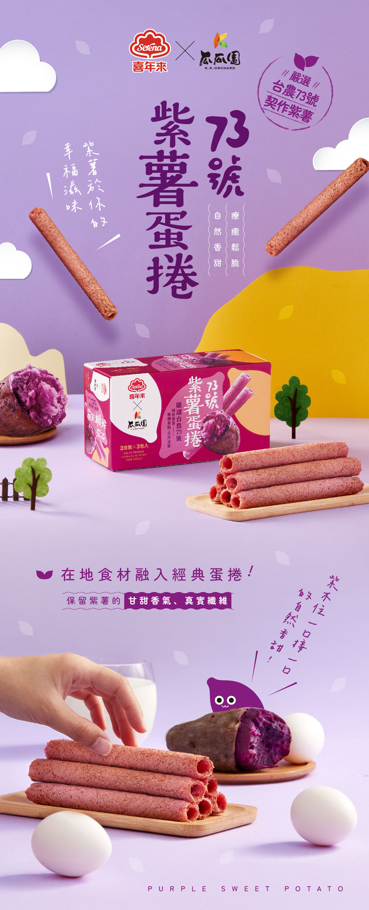 雞蛋、植物油(軟質棕油、脂肪酸丙二醇酯、脂肪酸甘油酯)、麵粉、砂糖、紫地瓜粉、紅甜菜粉(紅甜菜濃縮汁、麥芽糊精)、地瓜液體香料、維生素C(抗氧化劑)、鳳梨萃取物(鳳梨萃取物、麥芽糊精)